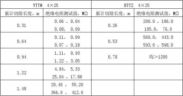 將兩種電纜樣品一端浸在水中3h后取出,從樣品的浸水端逐段切除,每截一段測(cè)量一次遺下部分的樣品絕緣,記錄測(cè)試結(jié)果。達(dá)到相同的絕緣值,截去的長度越大,則說明電纜吸潮越深,越不利于電纜的敷設(shè)。